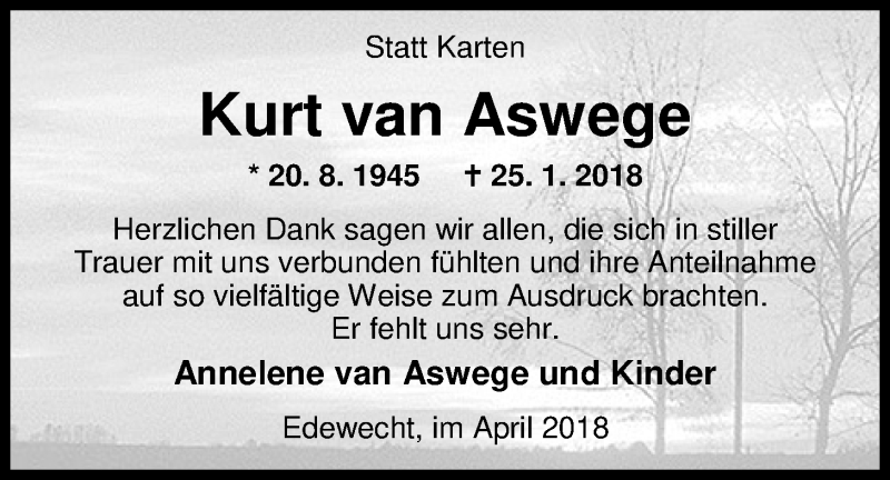 Hier finden Sie alle Traueranzeigen aus der Zeitung, die bisher für Kurt van Aswege erschienen sind. Weitere Traueranzeigen, die in der Zeitung erscheinen, werden hier ebenfalls aufgelistet