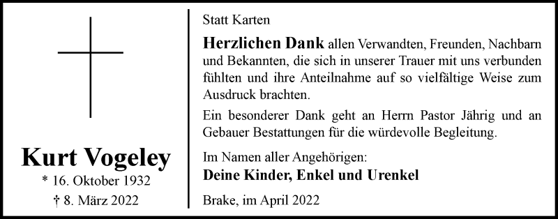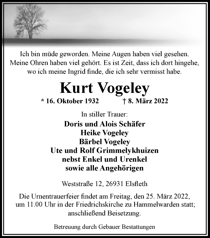 Hier finden Sie alle Traueranzeigen aus der Zeitung, die bisher für Kurt Vogeley erschienen sind. Weitere Traueranzeigen, die in der Zeitung erscheinen, werden hier ebenfalls aufgelistet
