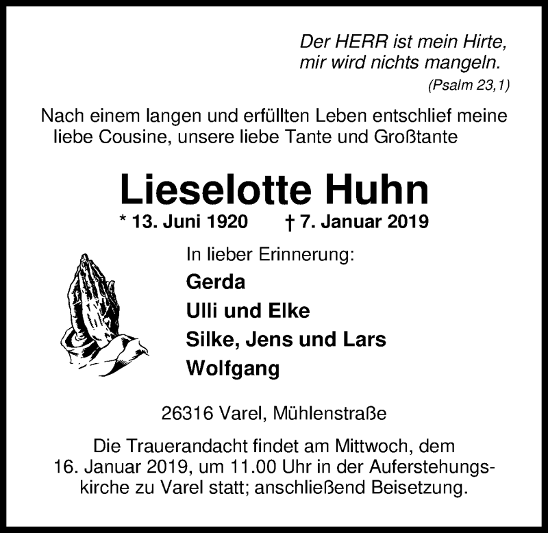Hier finden Sie alle Traueranzeigen aus der Zeitung, die bisher für Lieselotte Huhn erschienen sind. Weitere Traueranzeigen, die in der Zeitung erscheinen, werden hier ebenfalls aufgelistet