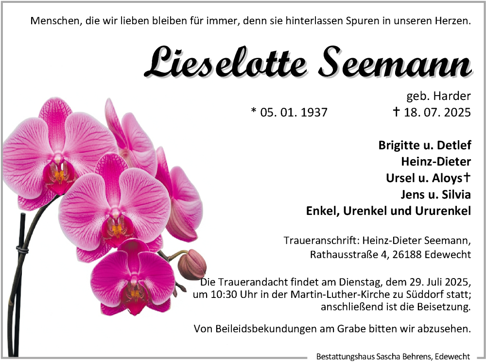 Hier finden Sie alle Traueranzeigen aus der Zeitung, die bisher für Lieselotte Seemann erschienen sind. Weitere Traueranzeigen, die in der Zeitung erscheinen, werden hier ebenfalls aufgelistet