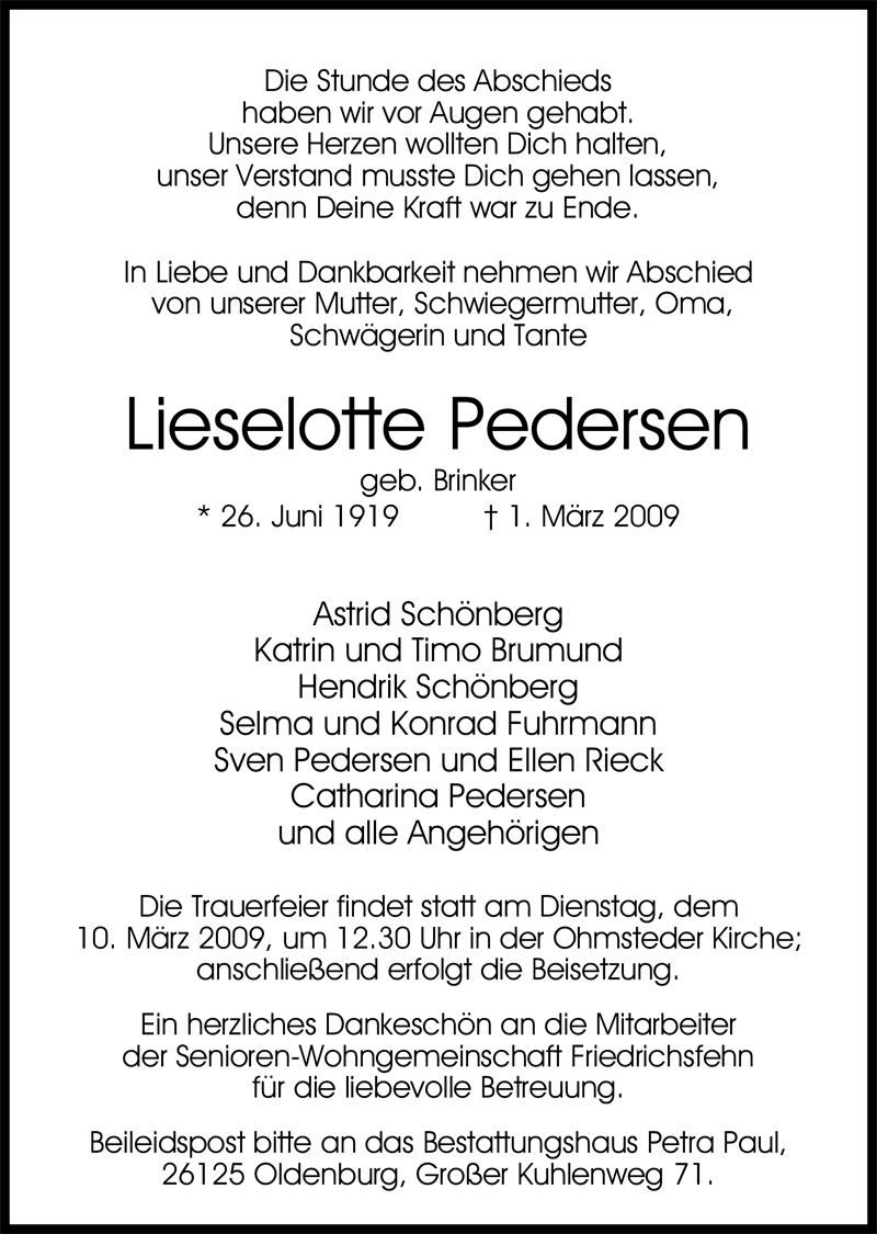 Hier finden Sie alle Traueranzeigen aus der Zeitung, die bisher für Lieselotte Pedersen erschienen sind. Weitere Traueranzeigen, die in der Zeitung erscheinen, werden hier ebenfalls aufgelistet