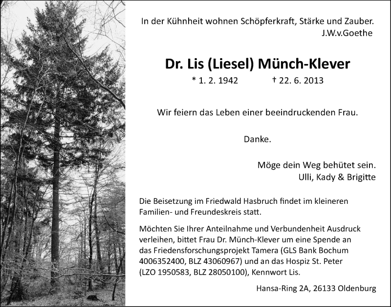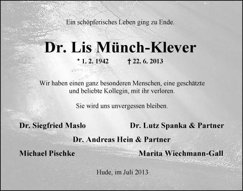 Hier finden Sie alle Traueranzeigen aus der Zeitung, die bisher für Lis Münch-Klever erschienen sind. Weitere Traueranzeigen, die in der Zeitung erscheinen, werden hier ebenfalls aufgelistet