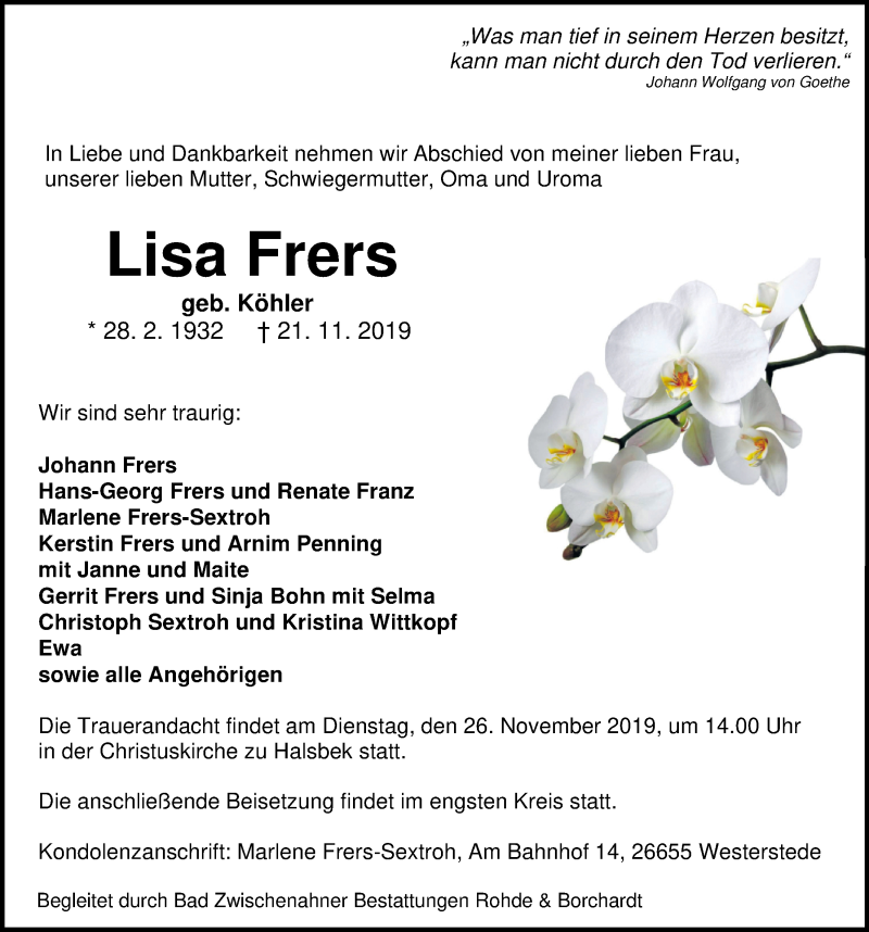 Hier finden Sie alle Traueranzeigen aus der Zeitung, die bisher für Lisa Frers erschienen sind. Weitere Traueranzeigen, die in der Zeitung erscheinen, werden hier ebenfalls aufgelistet