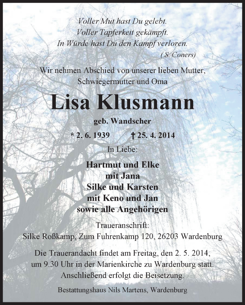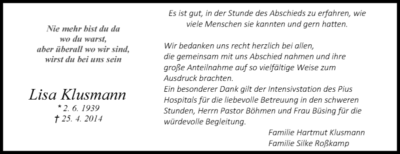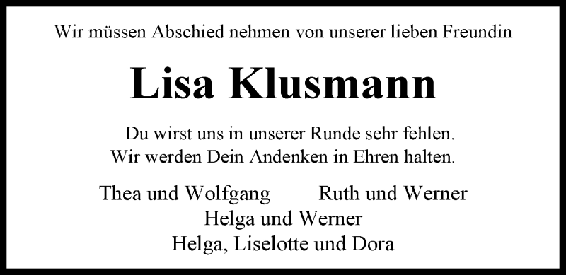 Hier finden Sie alle Traueranzeigen aus der Zeitung, die bisher für Lisa Klusmann erschienen sind. Weitere Traueranzeigen, die in der Zeitung erscheinen, werden hier ebenfalls aufgelistet