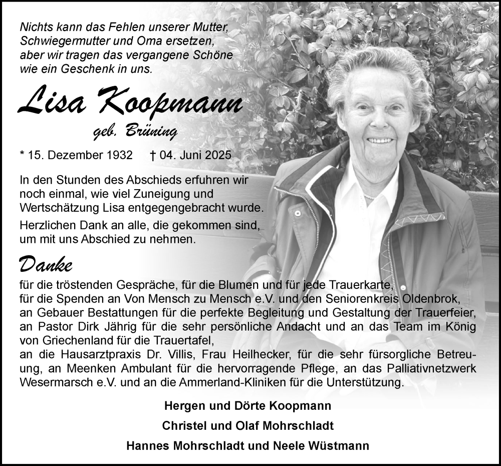 Hier finden Sie alle Traueranzeigen aus der Zeitung, die bisher für Lisa Koopmann erschienen sind. Weitere Traueranzeigen, die in der Zeitung erscheinen, werden hier ebenfalls aufgelistet