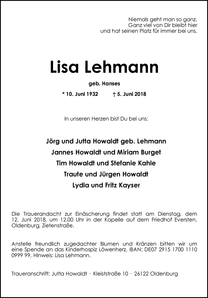 Hier finden Sie alle Traueranzeigen aus der Zeitung, die bisher für Lisa Lehmann erschienen sind. Weitere Traueranzeigen, die in der Zeitung erscheinen, werden hier ebenfalls aufgelistet