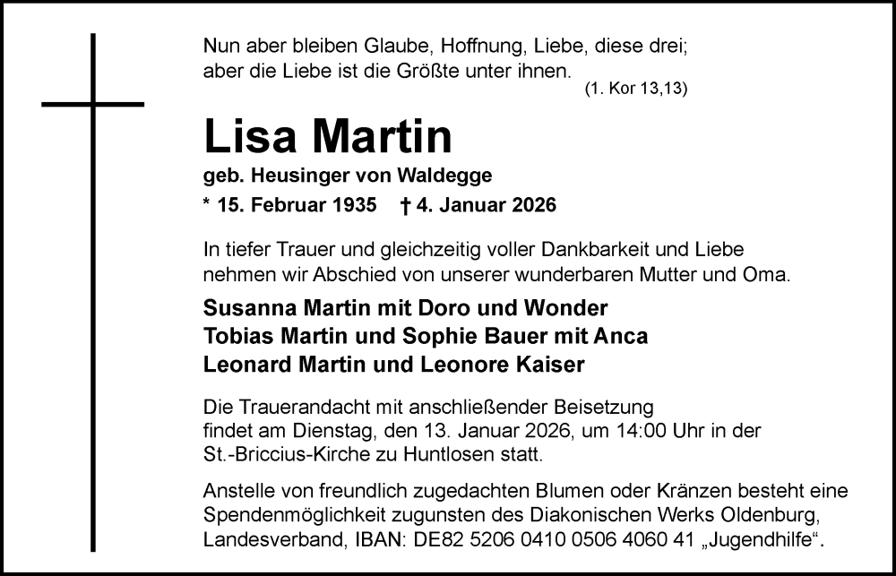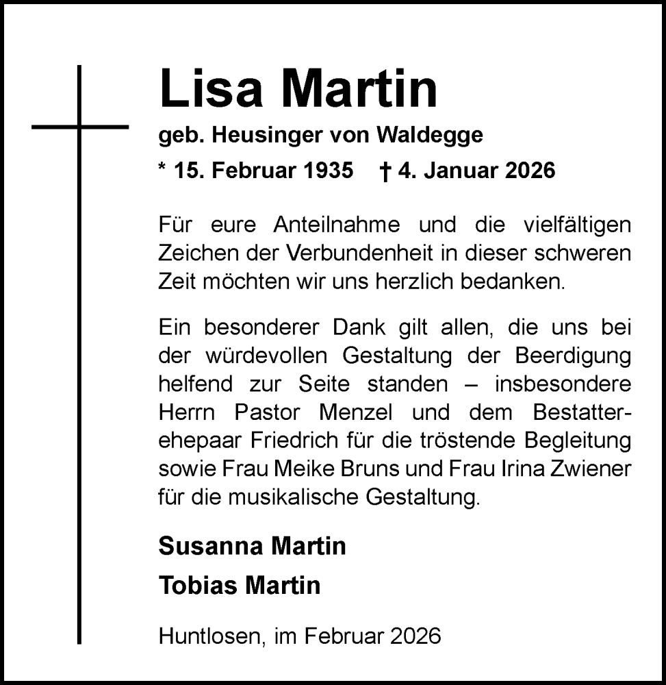 Hier finden Sie alle Traueranzeigen aus der Zeitung, die bisher für Lisa Martin erschienen sind. Weitere Traueranzeigen, die in der Zeitung erscheinen, werden hier ebenfalls aufgelistet