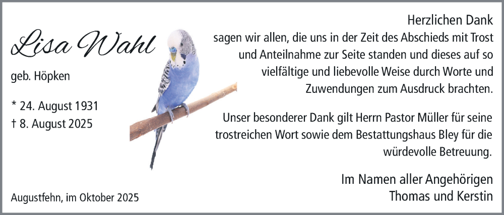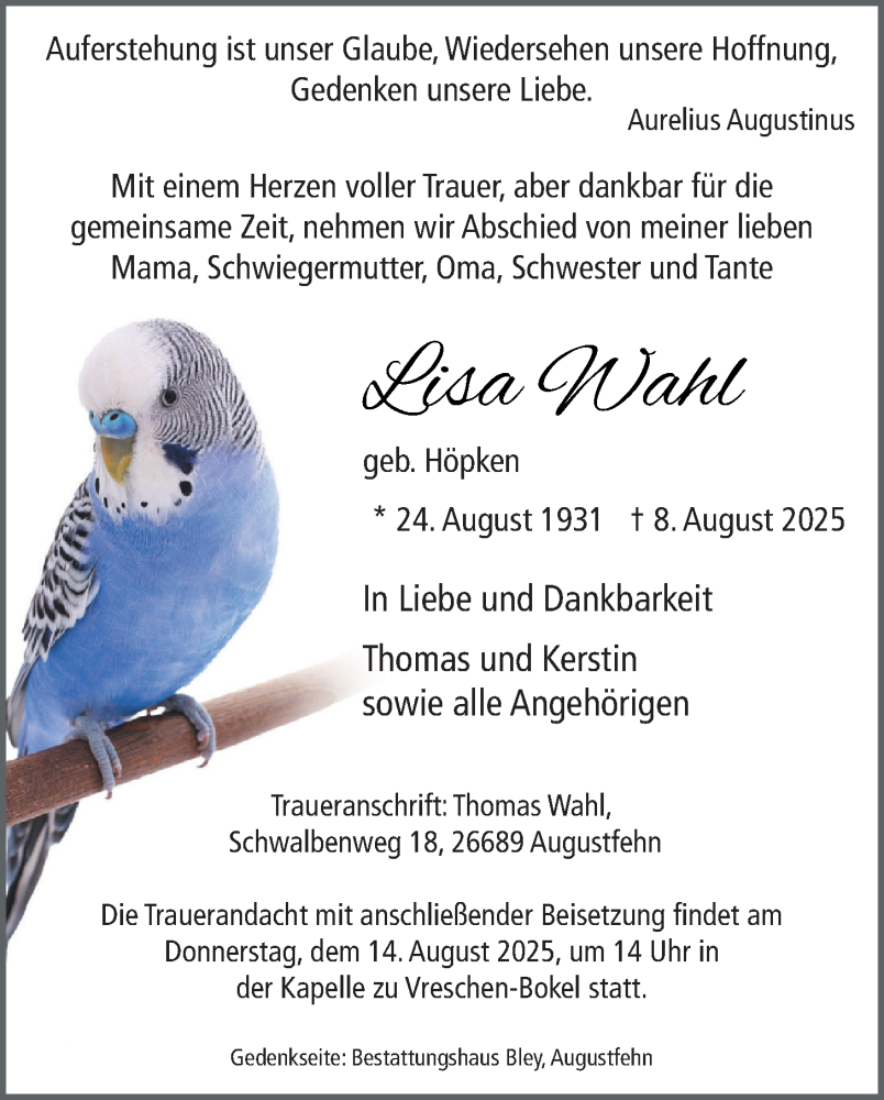 Hier finden Sie alle Traueranzeigen aus der Zeitung, die bisher für Lisa Wahl erschienen sind. Weitere Traueranzeigen, die in der Zeitung erscheinen, werden hier ebenfalls aufgelistet