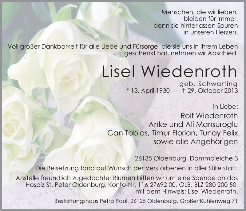 Hier finden Sie alle Traueranzeigen aus der Zeitung, die bisher für Lisel Wiedenroth erschienen sind. Weitere Traueranzeigen, die in der Zeitung erscheinen, werden hier ebenfalls aufgelistet