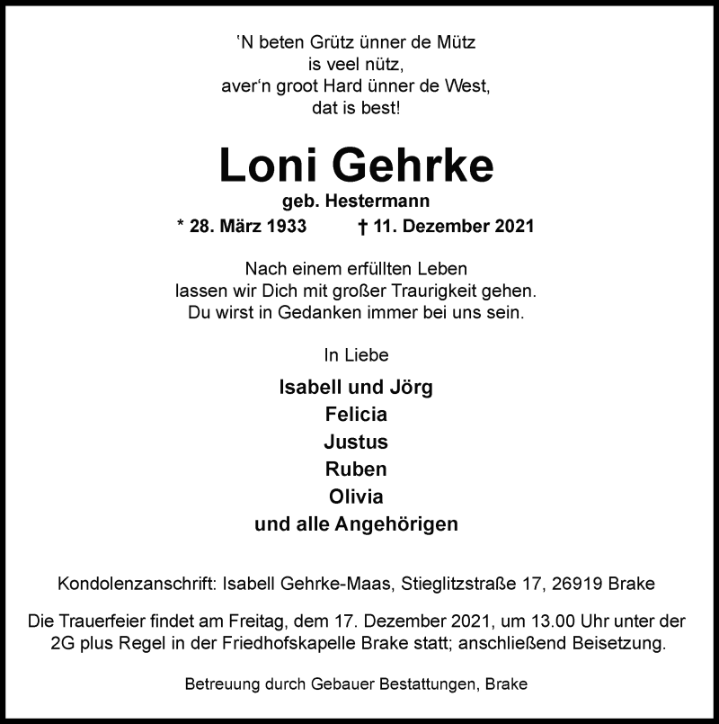 Hier finden Sie alle Traueranzeigen aus der Zeitung, die bisher für Loni Gehrke erschienen sind. Weitere Traueranzeigen, die in der Zeitung erscheinen, werden hier ebenfalls aufgelistet