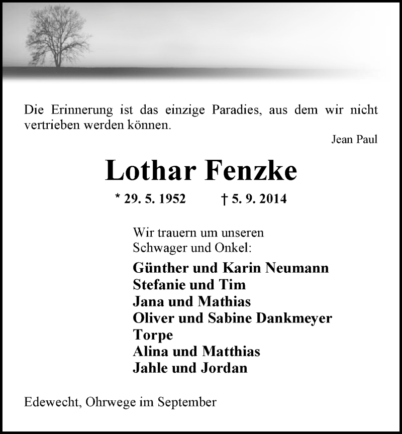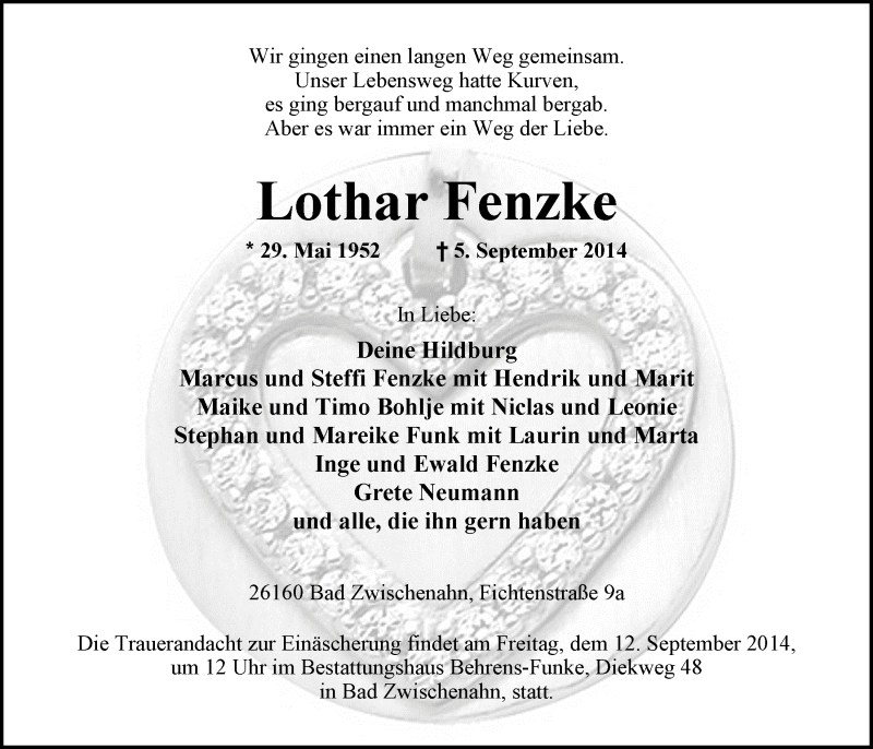 Hier finden Sie alle Traueranzeigen aus der Zeitung, die bisher für Lothar Fenzke erschienen sind. Weitere Traueranzeigen, die in der Zeitung erscheinen, werden hier ebenfalls aufgelistet