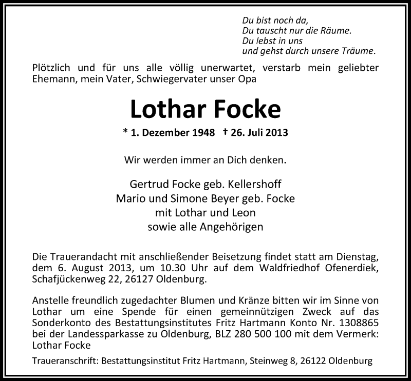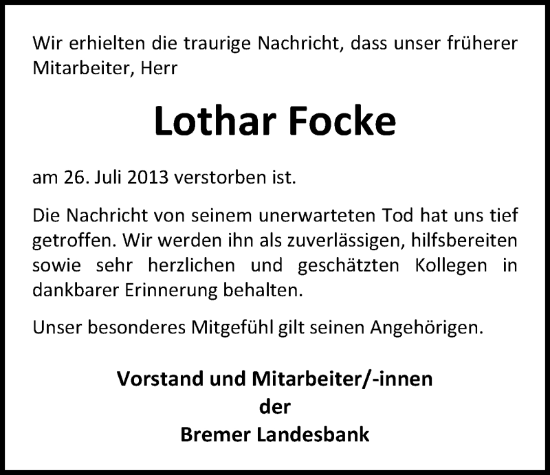 Hier finden Sie alle Traueranzeigen aus der Zeitung, die bisher für Lothar Focke erschienen sind. Weitere Traueranzeigen, die in der Zeitung erscheinen, werden hier ebenfalls aufgelistet