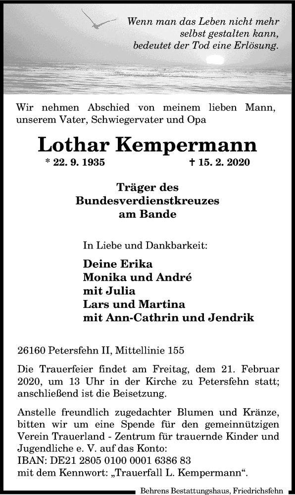 Hier finden Sie alle Traueranzeigen aus der Zeitung, die bisher für Lothar Kempermann erschienen sind. Weitere Traueranzeigen, die in der Zeitung erscheinen, werden hier ebenfalls aufgelistet
