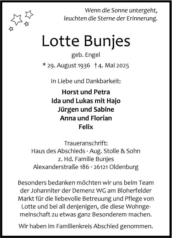 Hier finden Sie alle Traueranzeigen aus der Zeitung, die bisher für Lotte Bunjes erschienen sind. Weitere Traueranzeigen, die in der Zeitung erscheinen, werden hier ebenfalls aufgelistet
