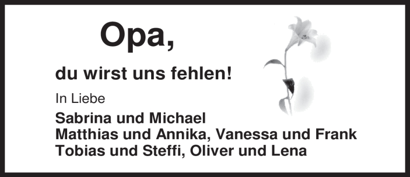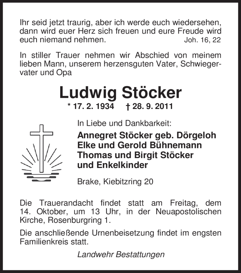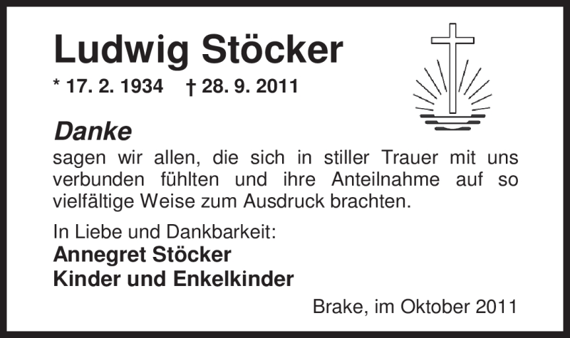 Hier finden Sie alle Traueranzeigen aus der Zeitung, die bisher für Ludwig Stöcker erschienen sind. Weitere Traueranzeigen, die in der Zeitung erscheinen, werden hier ebenfalls aufgelistet