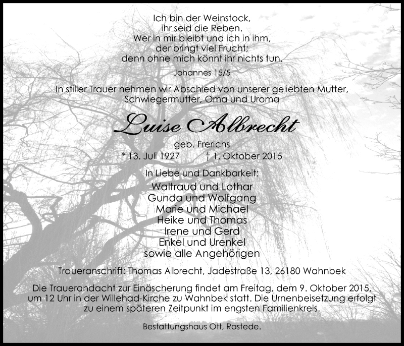 Hier finden Sie alle Traueranzeigen aus der Zeitung, die bisher für Luise Albrecht erschienen sind. Weitere Traueranzeigen, die in der Zeitung erscheinen, werden hier ebenfalls aufgelistet