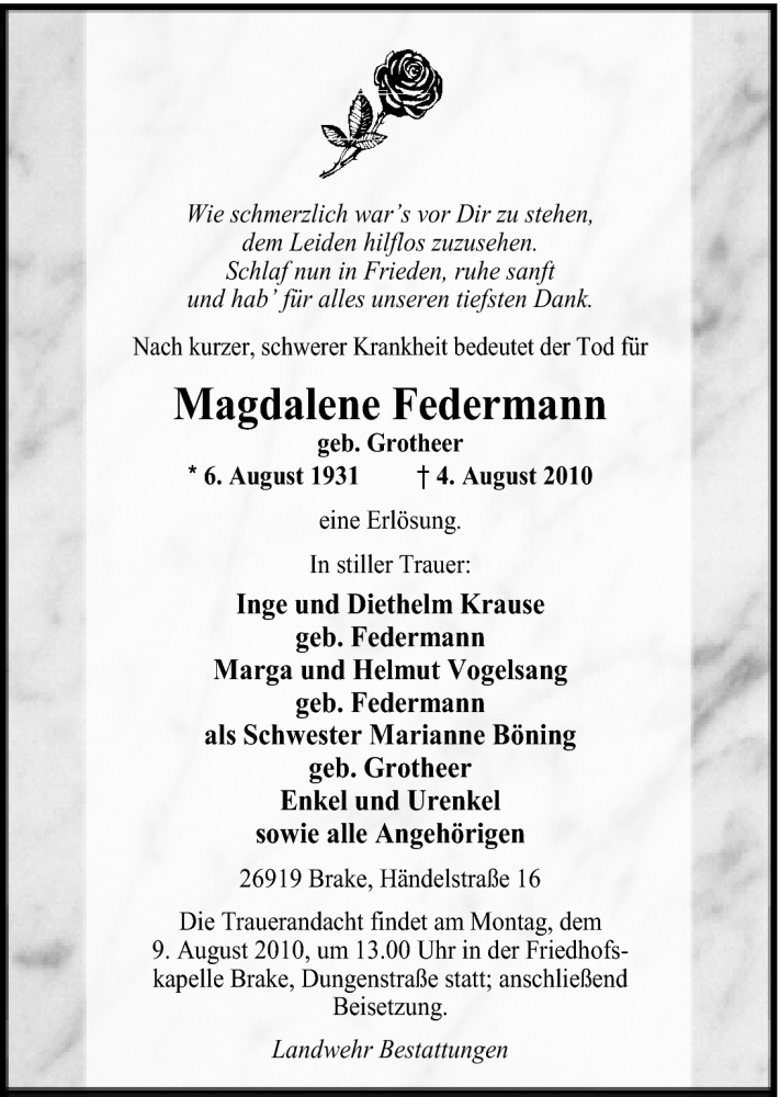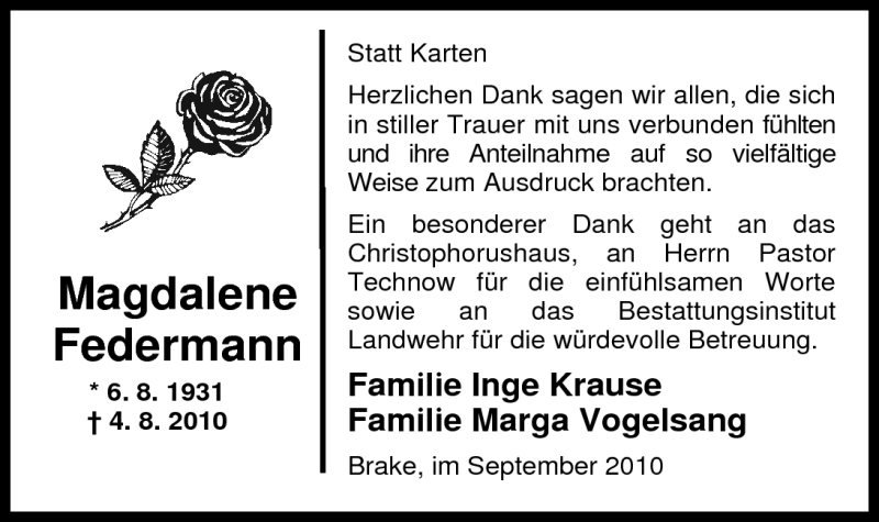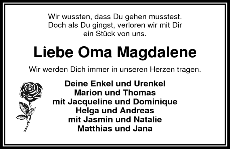 Hier finden Sie alle Traueranzeigen aus der Zeitung, die bisher für Magdalene Federmann erschienen sind. Weitere Traueranzeigen, die in der Zeitung erscheinen, werden hier ebenfalls aufgelistet