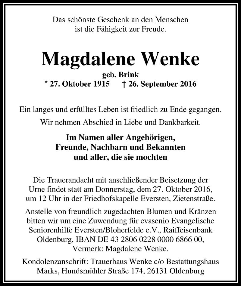 Hier finden Sie alle Traueranzeigen aus der Zeitung, die bisher für Magdalene Wenke erschienen sind. Weitere Traueranzeigen, die in der Zeitung erscheinen, werden hier ebenfalls aufgelistet