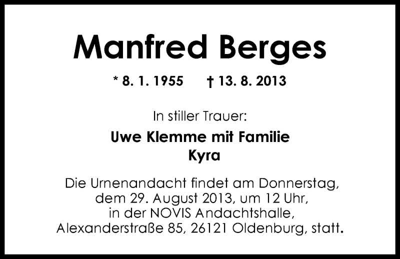 Hier finden Sie alle Traueranzeigen aus der Zeitung, die bisher für Manfred Berges erschienen sind. Weitere Traueranzeigen, die in der Zeitung erscheinen, werden hier ebenfalls aufgelistet