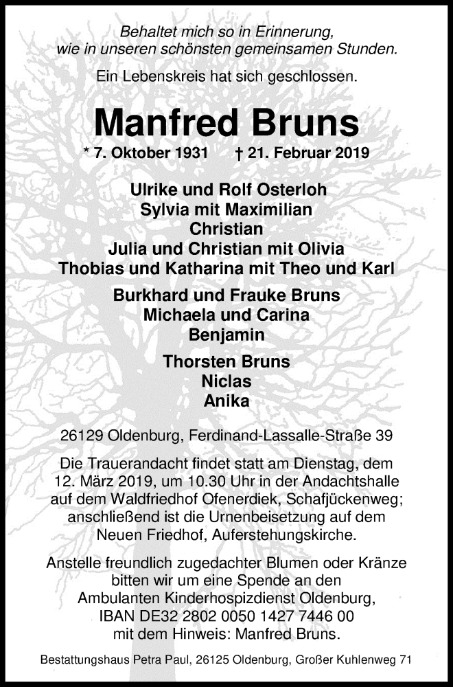 Hier finden Sie alle Traueranzeigen aus der Zeitung, die bisher für Manfred Bruns erschienen sind. Weitere Traueranzeigen, die in der Zeitung erscheinen, werden hier ebenfalls aufgelistet