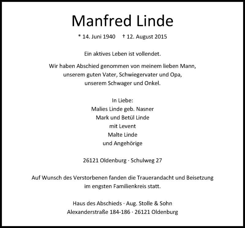 Hier finden Sie alle Traueranzeigen aus der Zeitung, die bisher für Manfred Linde erschienen sind. Weitere Traueranzeigen, die in der Zeitung erscheinen, werden hier ebenfalls aufgelistet