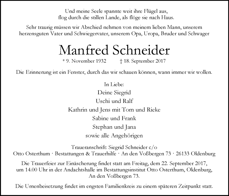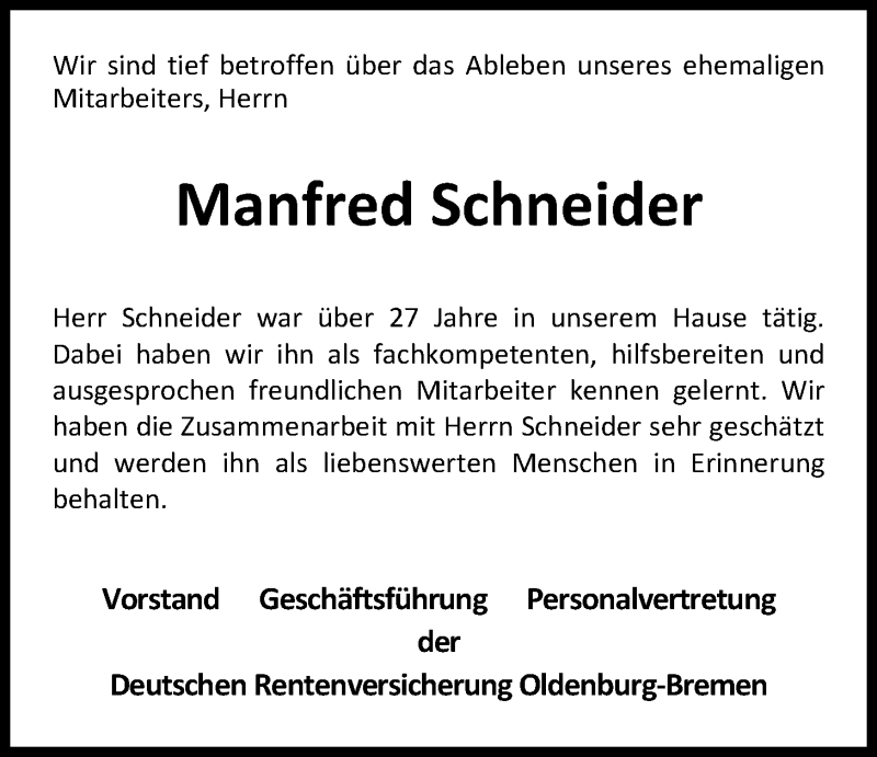 Hier finden Sie alle Traueranzeigen aus der Zeitung, die bisher für Manfred Schneider erschienen sind. Weitere Traueranzeigen, die in der Zeitung erscheinen, werden hier ebenfalls aufgelistet