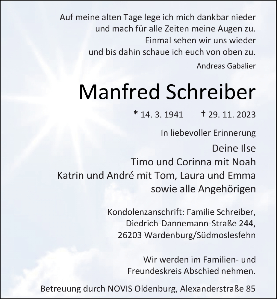 Hier finden Sie alle Traueranzeigen aus der Zeitung, die bisher für Manfred Schreiber erschienen sind. Weitere Traueranzeigen, die in der Zeitung erscheinen, werden hier ebenfalls aufgelistet