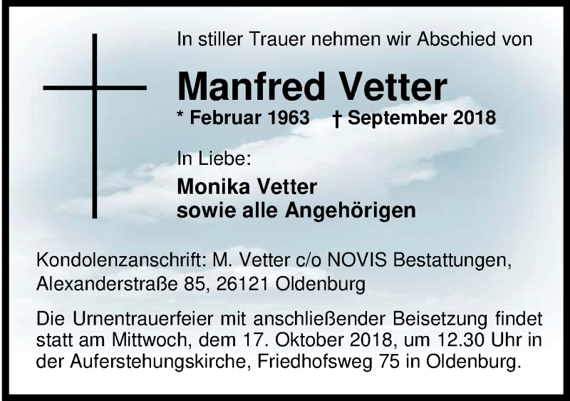Hier finden Sie alle Traueranzeigen aus der Zeitung, die bisher für Manfred Vetter erschienen sind. Weitere Traueranzeigen, die in der Zeitung erscheinen, werden hier ebenfalls aufgelistet
