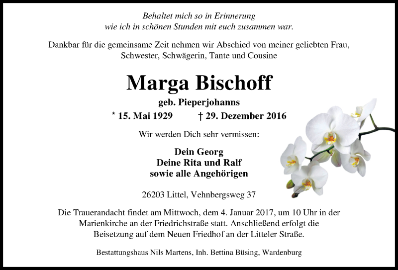 Hier finden Sie alle Traueranzeigen aus der Zeitung, die bisher für Marga Bischoff erschienen sind. Weitere Traueranzeigen, die in der Zeitung erscheinen, werden hier ebenfalls aufgelistet