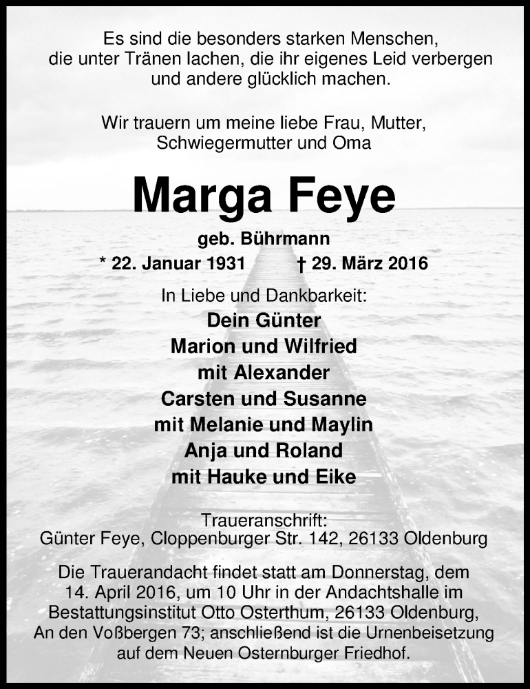 Hier finden Sie alle Traueranzeigen aus der Zeitung, die bisher für Marga Feye erschienen sind. Weitere Traueranzeigen, die in der Zeitung erscheinen, werden hier ebenfalls aufgelistet