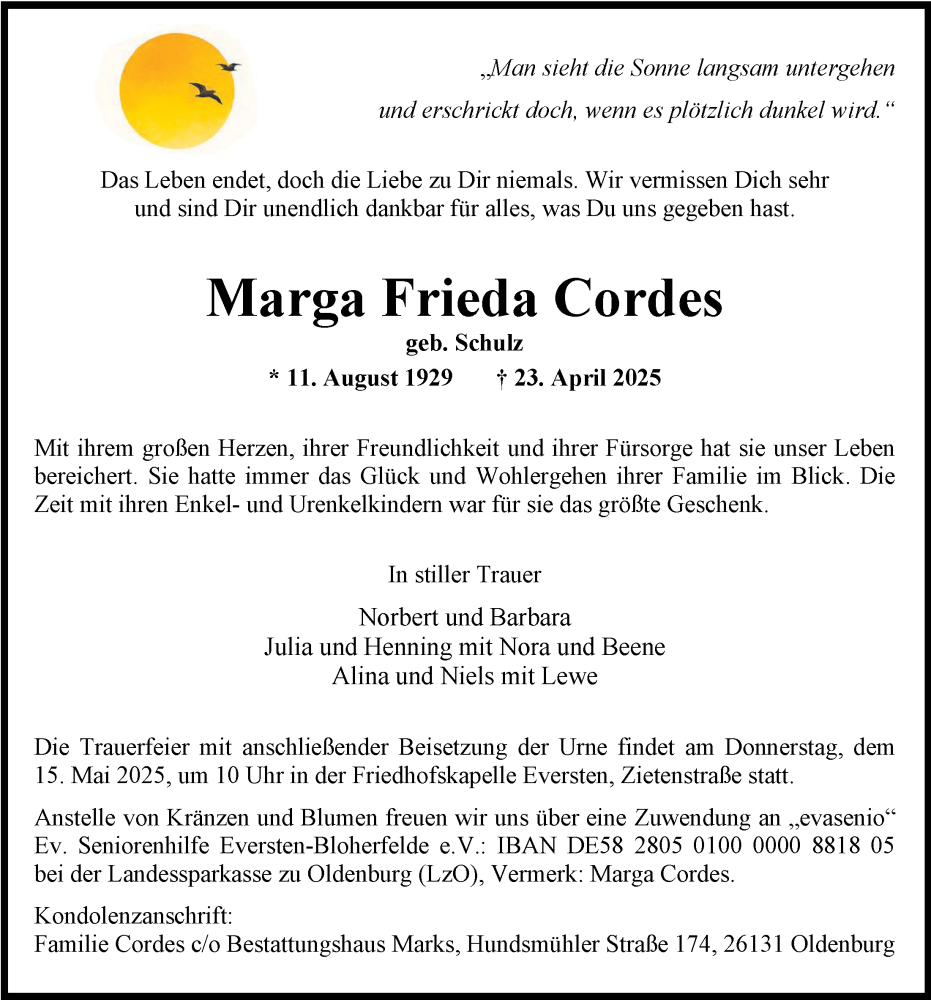 Hier finden Sie alle Traueranzeigen aus der Zeitung, die bisher für Marga Frieda Cordes erschienen sind. Weitere Traueranzeigen, die in der Zeitung erscheinen, werden hier ebenfalls aufgelistet