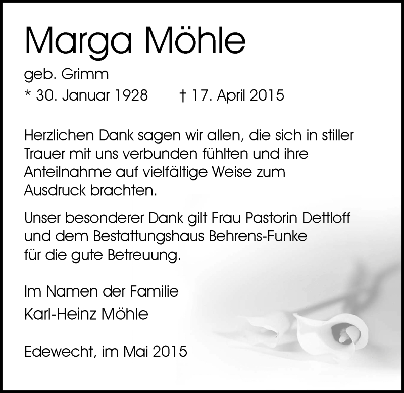 Hier finden Sie alle Traueranzeigen aus der Zeitung, die bisher für Marga Möhle erschienen sind. Weitere Traueranzeigen, die in der Zeitung erscheinen, werden hier ebenfalls aufgelistet