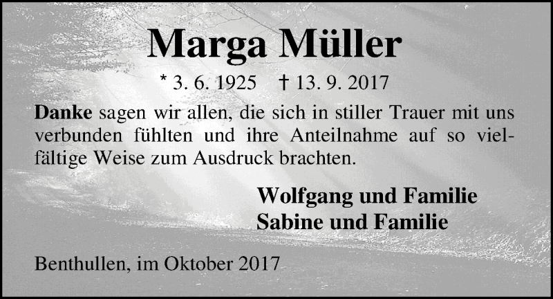 Hier finden Sie alle Traueranzeigen aus der Zeitung, die bisher für Marga Müller erschienen sind. Weitere Traueranzeigen, die in der Zeitung erscheinen, werden hier ebenfalls aufgelistet