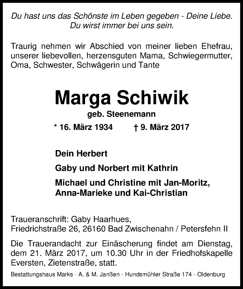 Hier finden Sie alle Traueranzeigen aus der Zeitung, die bisher für Marga Schiwik erschienen sind. Weitere Traueranzeigen, die in der Zeitung erscheinen, werden hier ebenfalls aufgelistet
