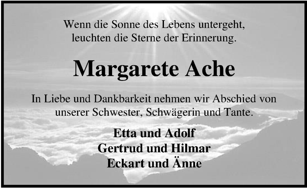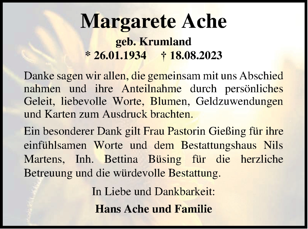 Hier finden Sie alle Traueranzeigen aus der Zeitung, die bisher für Margarete Ache erschienen sind. Weitere Traueranzeigen, die in der Zeitung erscheinen, werden hier ebenfalls aufgelistet