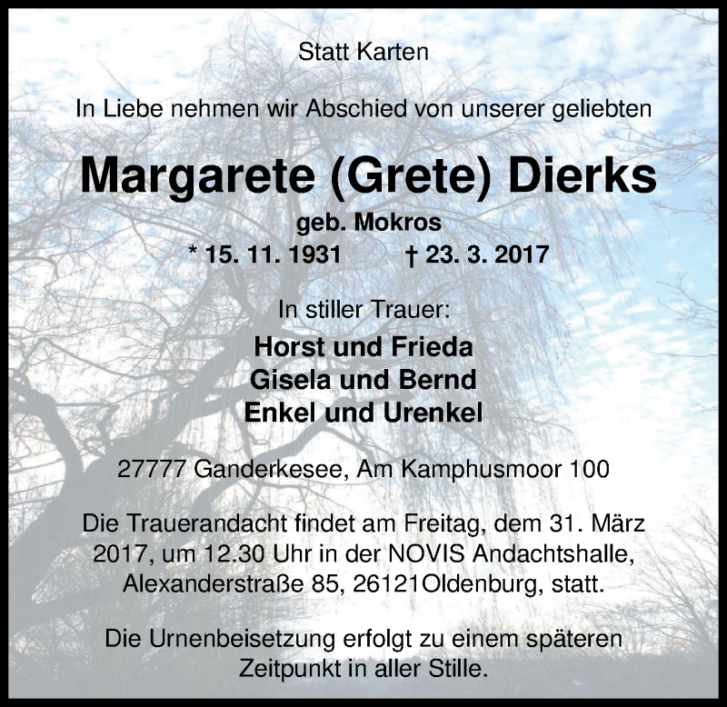 Hier finden Sie alle Traueranzeigen aus der Zeitung, die bisher für Margarete Dierks erschienen sind. Weitere Traueranzeigen, die in der Zeitung erscheinen, werden hier ebenfalls aufgelistet