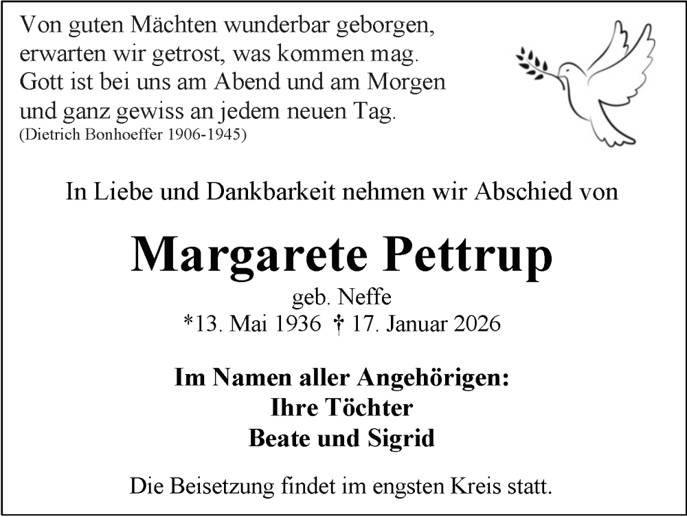 Hier finden Sie alle Traueranzeigen aus der Zeitung, die bisher für Margarete Pettrup erschienen sind. Weitere Traueranzeigen, die in der Zeitung erscheinen, werden hier ebenfalls aufgelistet