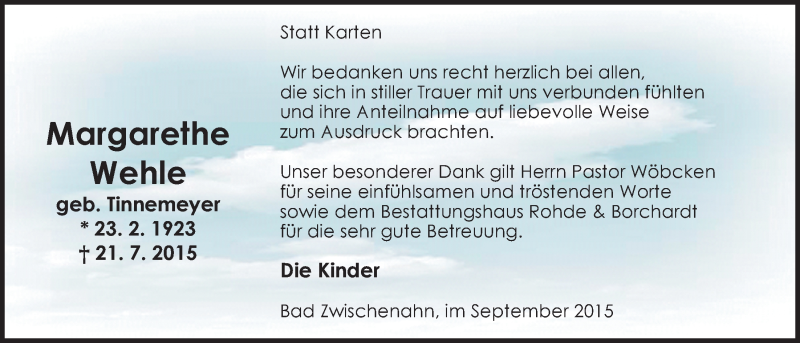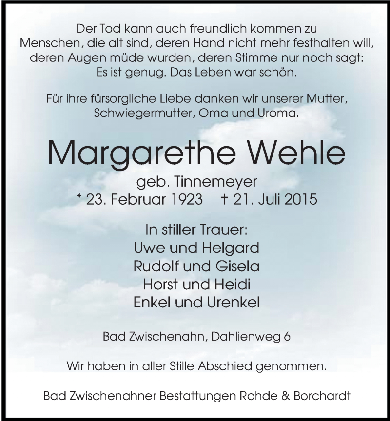 Hier finden Sie alle Traueranzeigen aus der Zeitung, die bisher für Margarethe Wehle erschienen sind. Weitere Traueranzeigen, die in der Zeitung erscheinen, werden hier ebenfalls aufgelistet