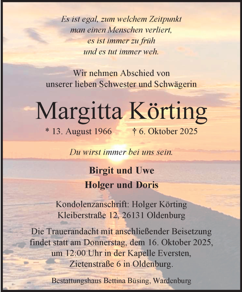 Hier finden Sie alle Traueranzeigen aus der Zeitung, die bisher für Margitta Körting erschienen sind. Weitere Traueranzeigen, die in der Zeitung erscheinen, werden hier ebenfalls aufgelistet