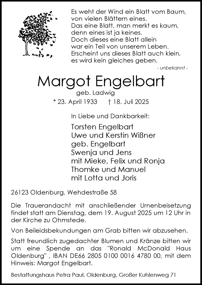 Hier finden Sie alle Traueranzeigen aus der Zeitung, die bisher für Margot Engelbart erschienen sind. Weitere Traueranzeigen, die in der Zeitung erscheinen, werden hier ebenfalls aufgelistet