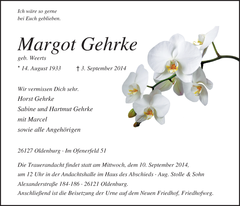 Hier finden Sie alle Traueranzeigen aus der Zeitung, die bisher für Margot Gehrke erschienen sind. Weitere Traueranzeigen, die in der Zeitung erscheinen, werden hier ebenfalls aufgelistet