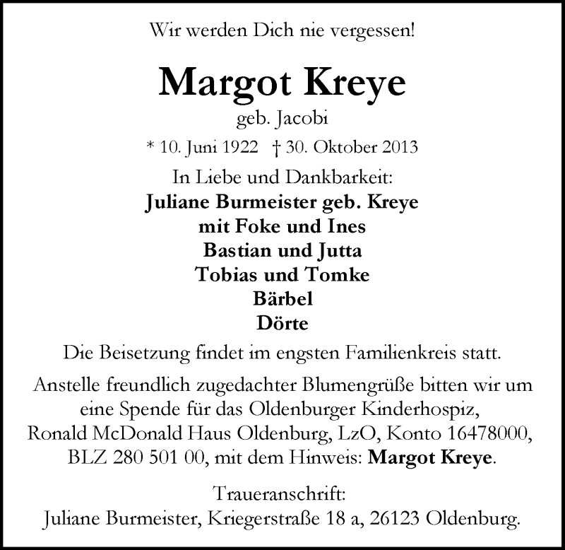 Hier finden Sie alle Traueranzeigen aus der Zeitung, die bisher für Margot Kreye erschienen sind. Weitere Traueranzeigen, die in der Zeitung erscheinen, werden hier ebenfalls aufgelistet