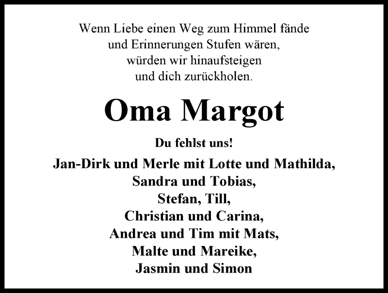 Hier finden Sie alle Traueranzeigen aus der Zeitung, die bisher für Margot Poppen erschienen sind. Weitere Traueranzeigen, die in der Zeitung erscheinen, werden hier ebenfalls aufgelistet