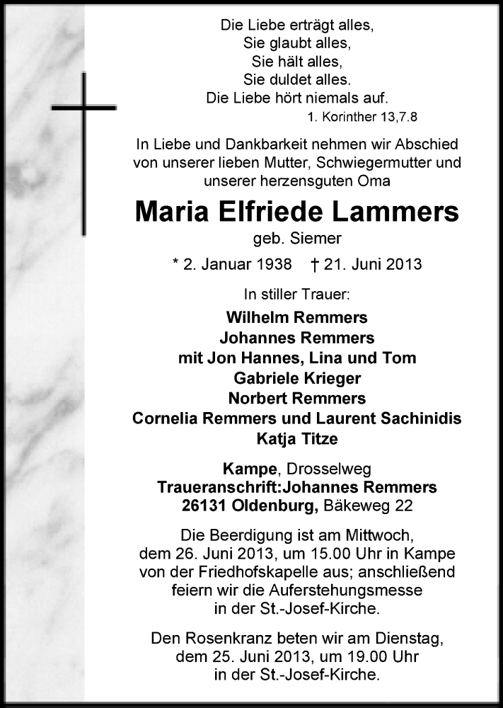Hier finden Sie alle Traueranzeigen aus der Zeitung, die bisher für Maria Elfriede Lammers erschienen sind. Weitere Traueranzeigen, die in der Zeitung erscheinen, werden hier ebenfalls aufgelistet