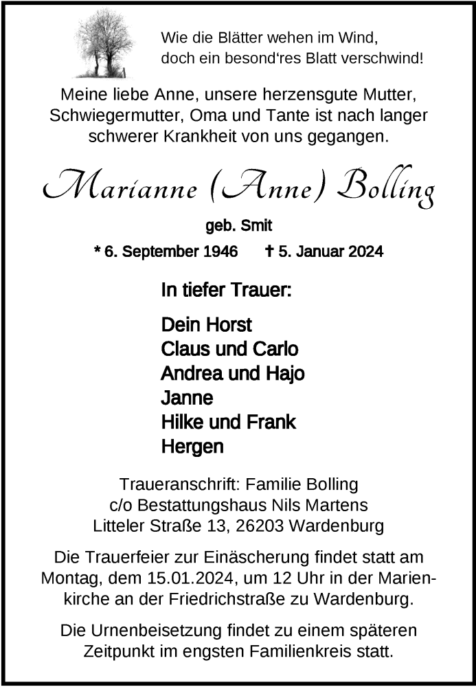 Hier finden Sie alle Traueranzeigen aus der Zeitung, die bisher für Marianne Bolling erschienen sind. Weitere Traueranzeigen, die in der Zeitung erscheinen, werden hier ebenfalls aufgelistet