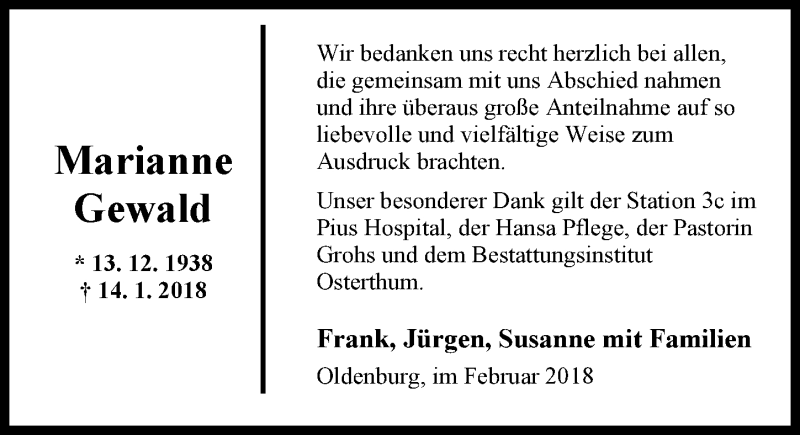 Hier finden Sie alle Traueranzeigen aus der Zeitung, die bisher für Marianne Gewald erschienen sind. Weitere Traueranzeigen, die in der Zeitung erscheinen, werden hier ebenfalls aufgelistet