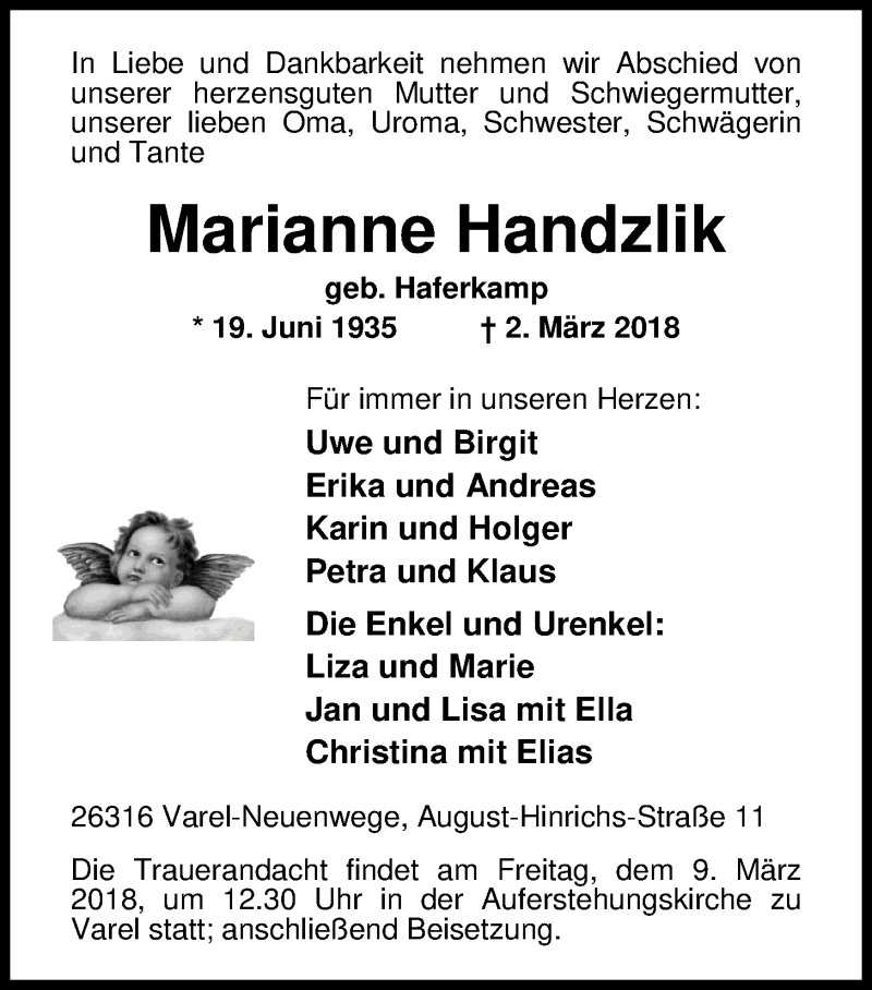 Hier finden Sie alle Traueranzeigen aus der Zeitung, die bisher für Marianne Handzlik erschienen sind. Weitere Traueranzeigen, die in der Zeitung erscheinen, werden hier ebenfalls aufgelistet