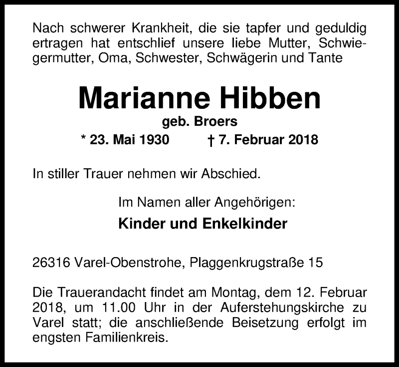Hier finden Sie alle Traueranzeigen aus der Zeitung, die bisher für Marianne Hibben erschienen sind. Weitere Traueranzeigen, die in der Zeitung erscheinen, werden hier ebenfalls aufgelistet