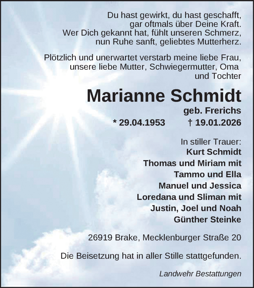 Hier finden Sie alle Traueranzeigen aus der Zeitung, die bisher für Marianne Schmidt erschienen sind. Weitere Traueranzeigen, die in der Zeitung erscheinen, werden hier ebenfalls aufgelistet