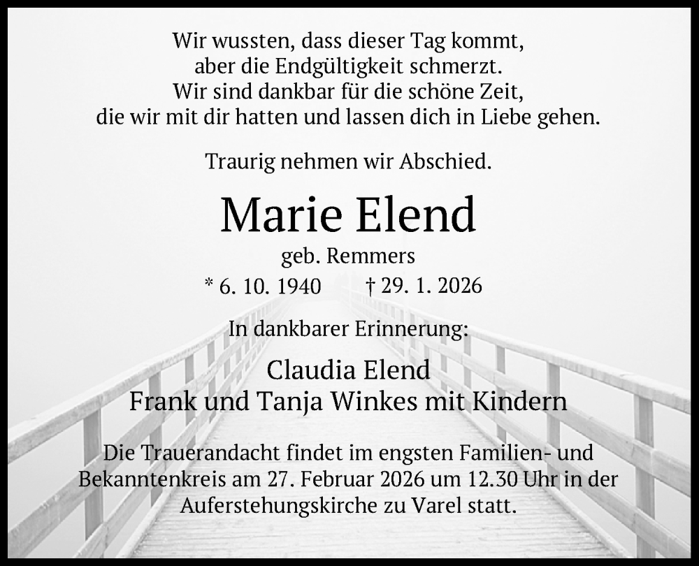 Hier finden Sie alle Traueranzeigen aus der Zeitung, die bisher für Marie Elend erschienen sind. Weitere Traueranzeigen, die in der Zeitung erscheinen, werden hier ebenfalls aufgelistet